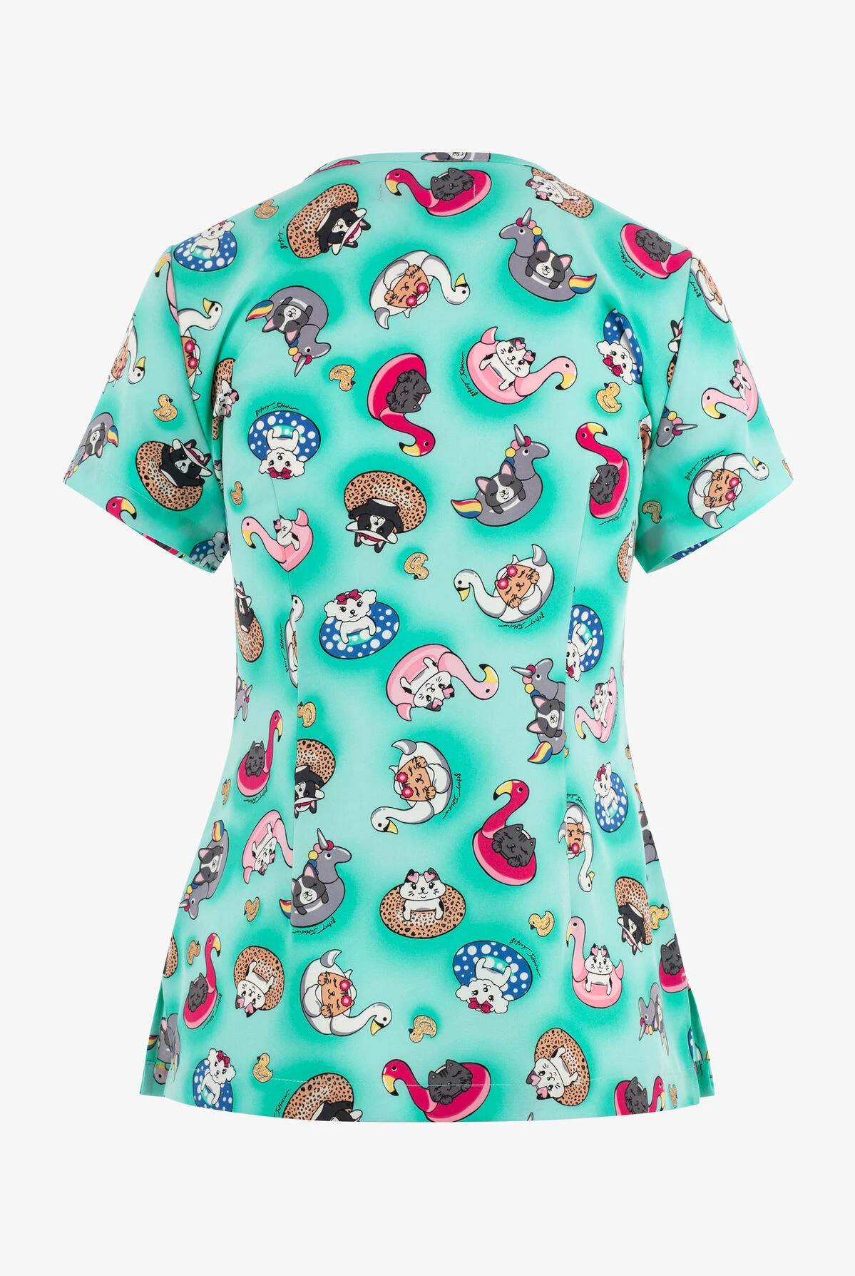 - Adorable cats and dogs on floaties with gold flecked rubber duckies on a tonal mint background