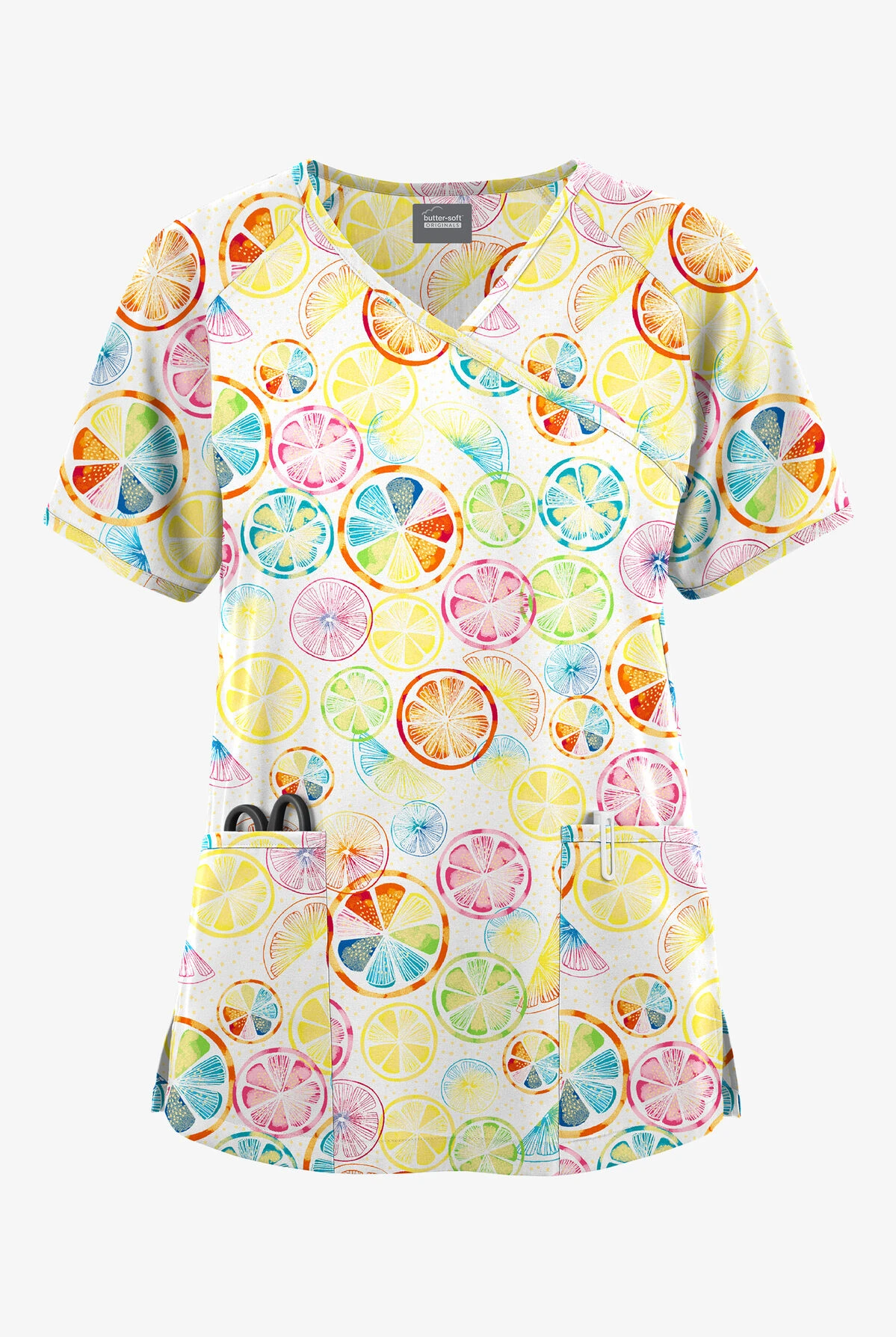 - Features multicolor citrus slices on white