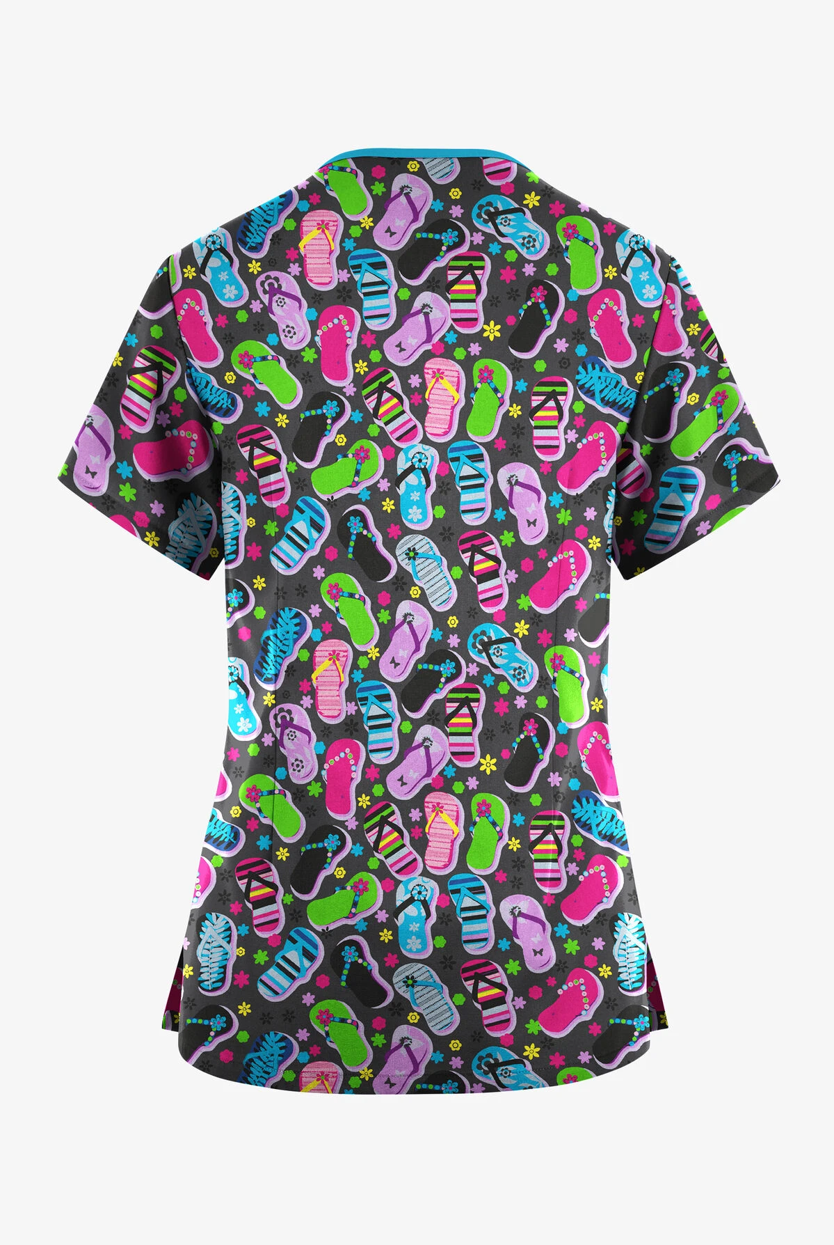 Butter-Soft Originals Flip Flop Fun Pewter Women’s 3-Pocket Criss Cross Printed Scrub Top