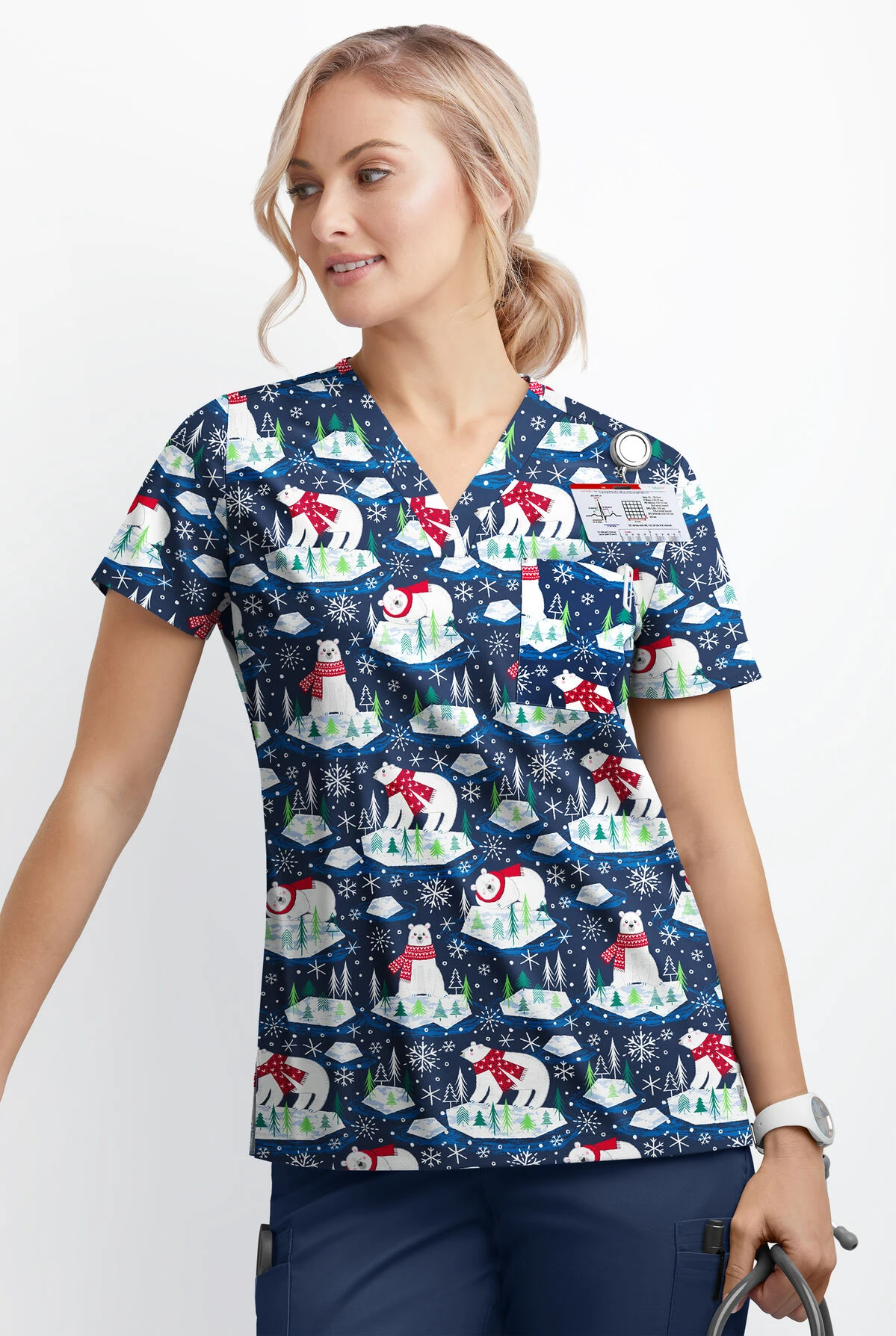 Our women’s scrub top is a V-neck shape, with a twist—the neckline has a slight curve and stitching that is both feminine and flattering. Simple, modern styling features a single front pocket. Each piece in our Butter-Soft STRETCH scrub collection was designed for 12+ hour shifts, and made from easy-care, 2-way stretch comfort fabric. Polar bears can be fierce – and the holiday variety are no exception. They’re just fiercely fun!