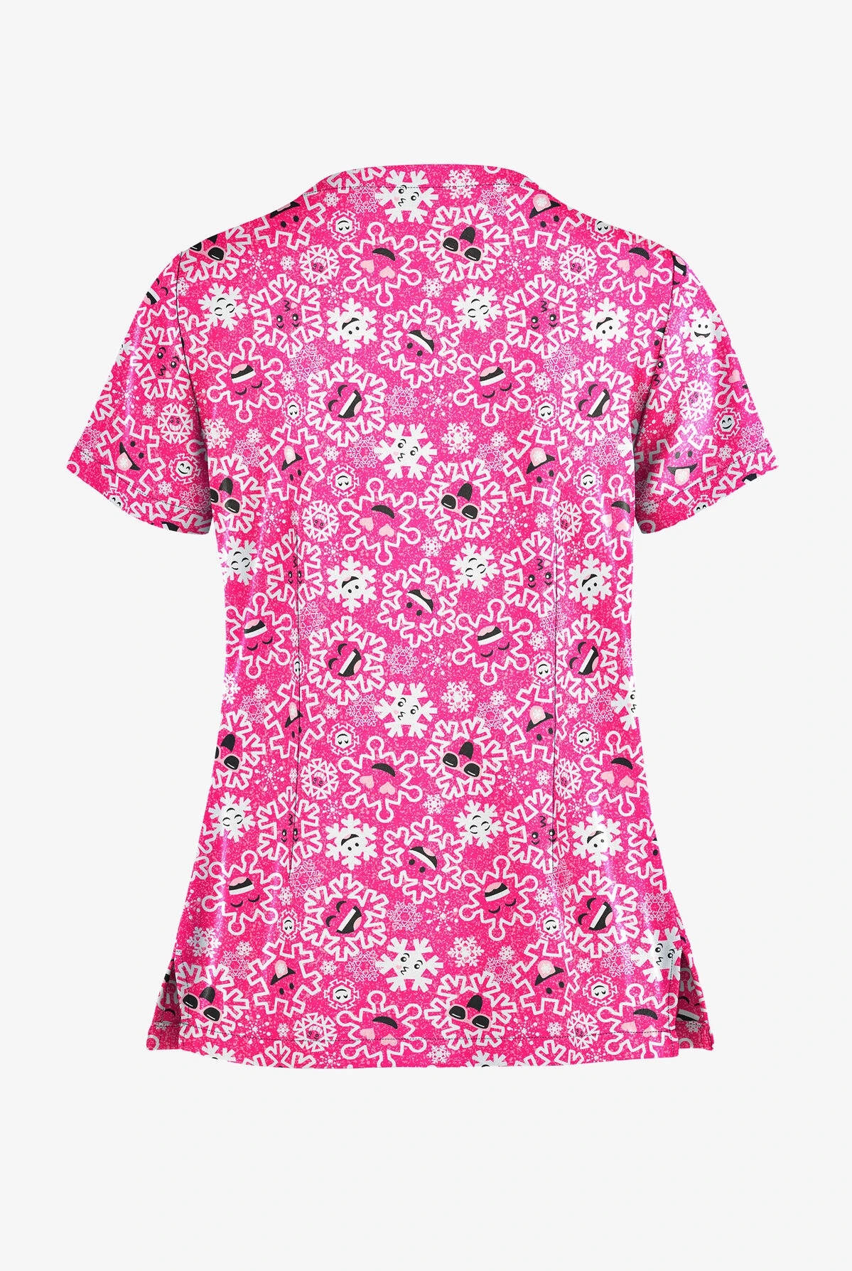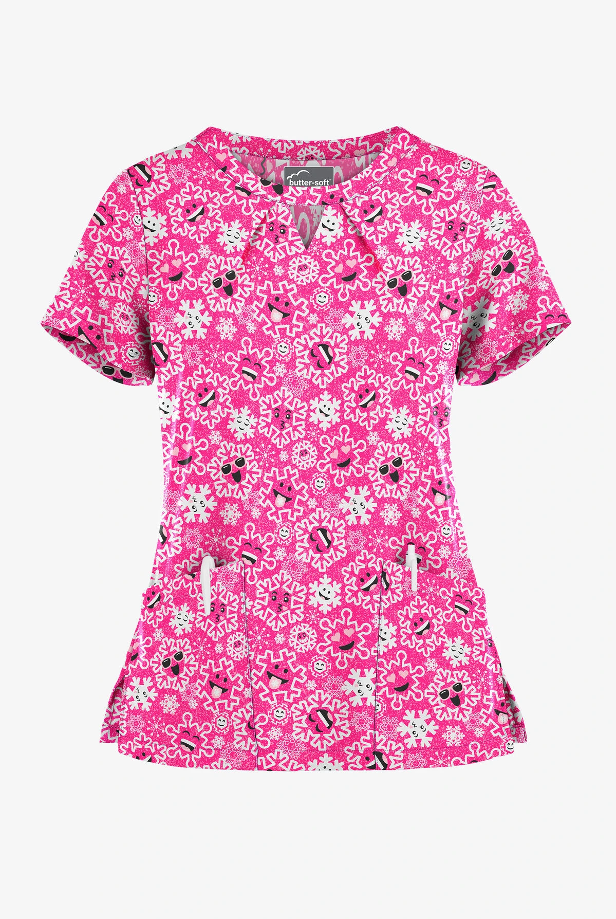 The first thing you’ll notice about this top is its very pretty neckline—a center-front notch and pleats with a smooth band. Back darts give it shape, for an overall classic fit. (So comfortable during a long shift.) Short sleeves, 2 pockets and side vents for ease.