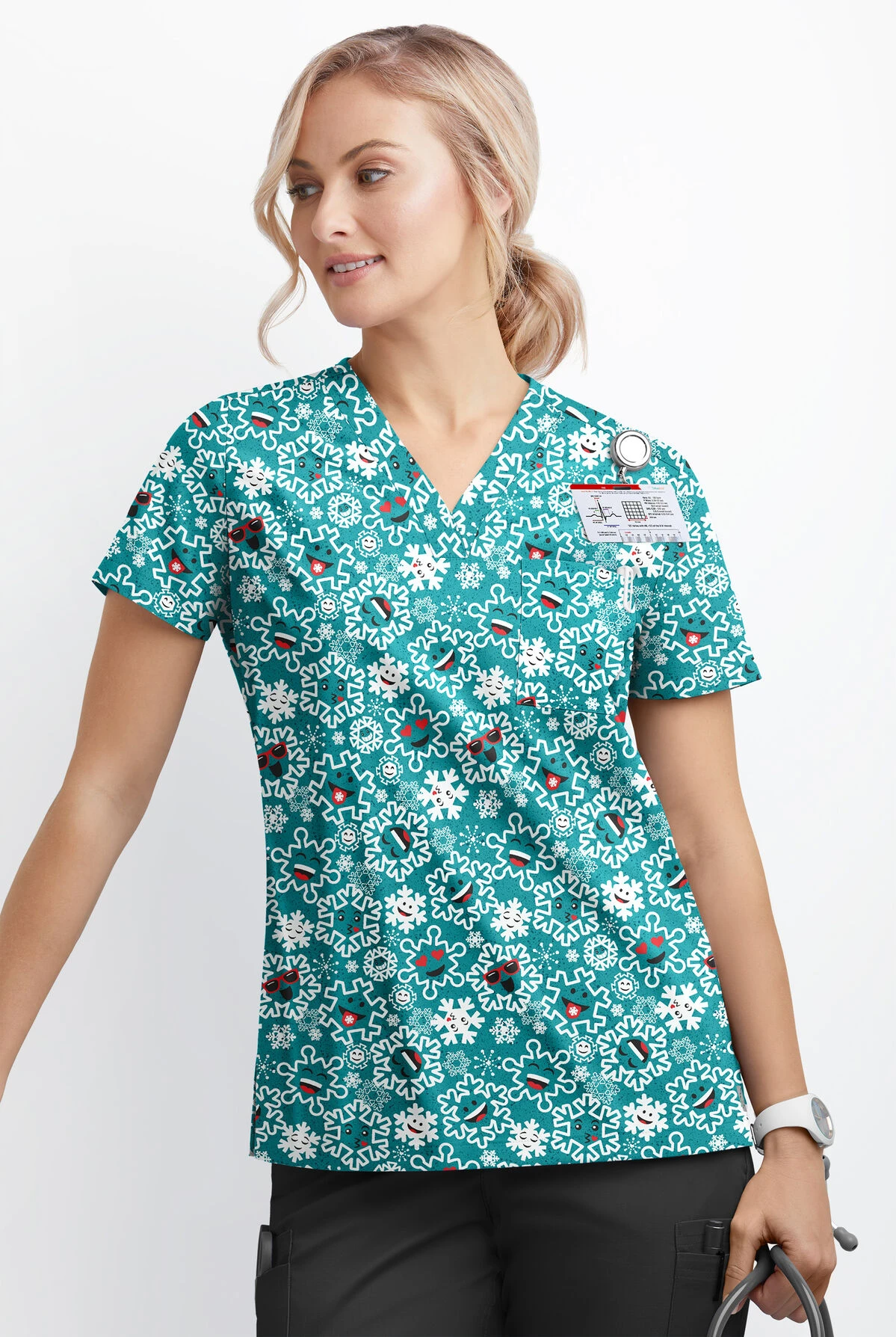 Our women’s scrub top is a V-neck shape, with a twist—the neckline has a slight curve and stitching that is both feminine and flattering. Simple, modern styling features a single front pocket. Each piece in our Butter-Soft STRETCH scrub collection was designed for 12+ hour shifts, and made from easy-care, 2-way stretch comfort fabric. Snowflakes? Smiling? Why not! Smiles are always welcome – and a little whimsy helps the shift fly by.