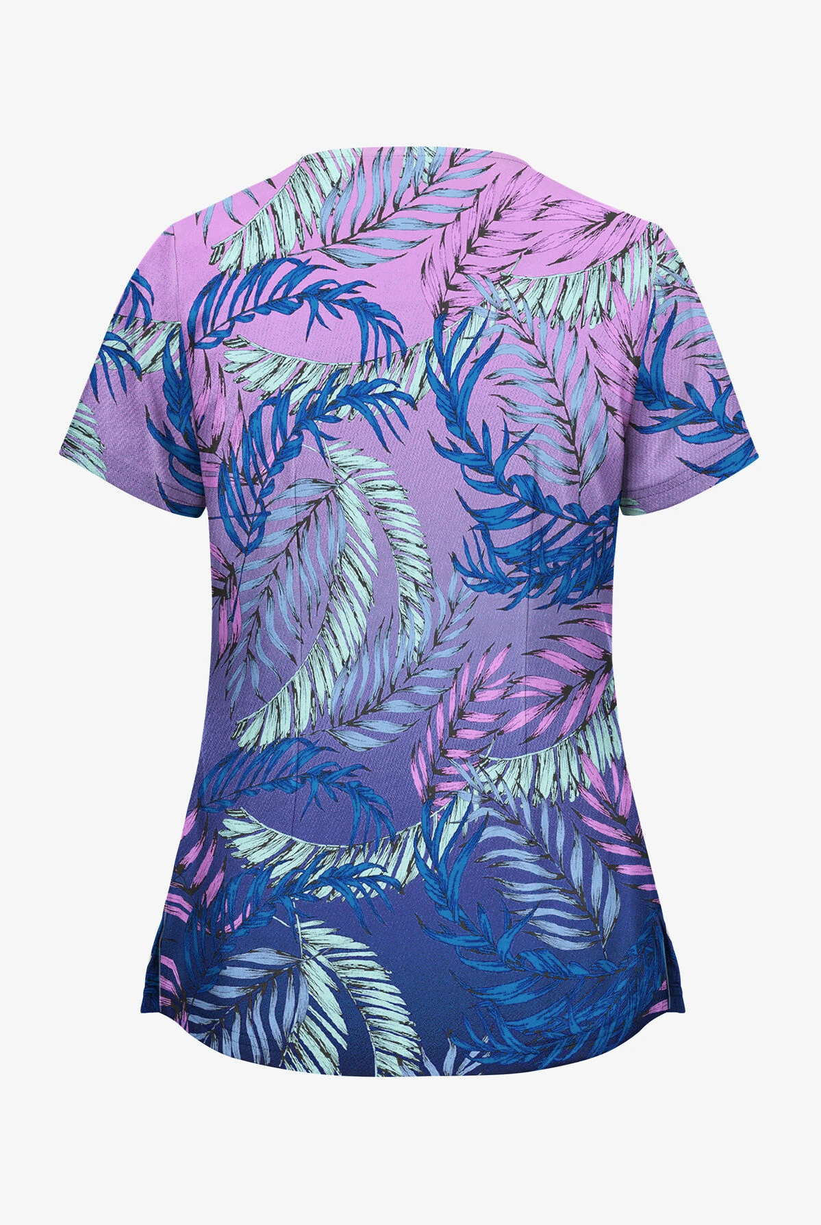 The Butter-soft Stretch palm fronds aqua moon women’s 2-pocket v-neck print scrub top features a relaxed classic fit with a flattering shaped v-neck. It has 2 roomy angled welt pockets. The top also includes side vents for ease of movement during long days. The top has back darts for better fit. Also, it has a double needle top-stitch throughout. Made of 97/3 poly/spandex.