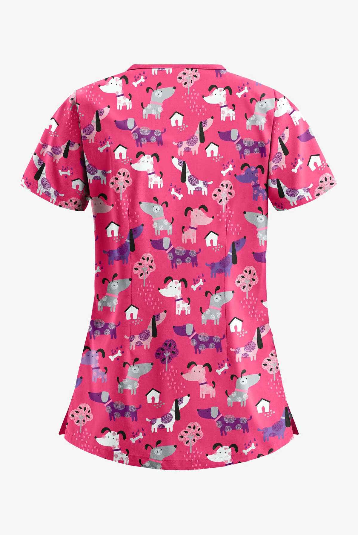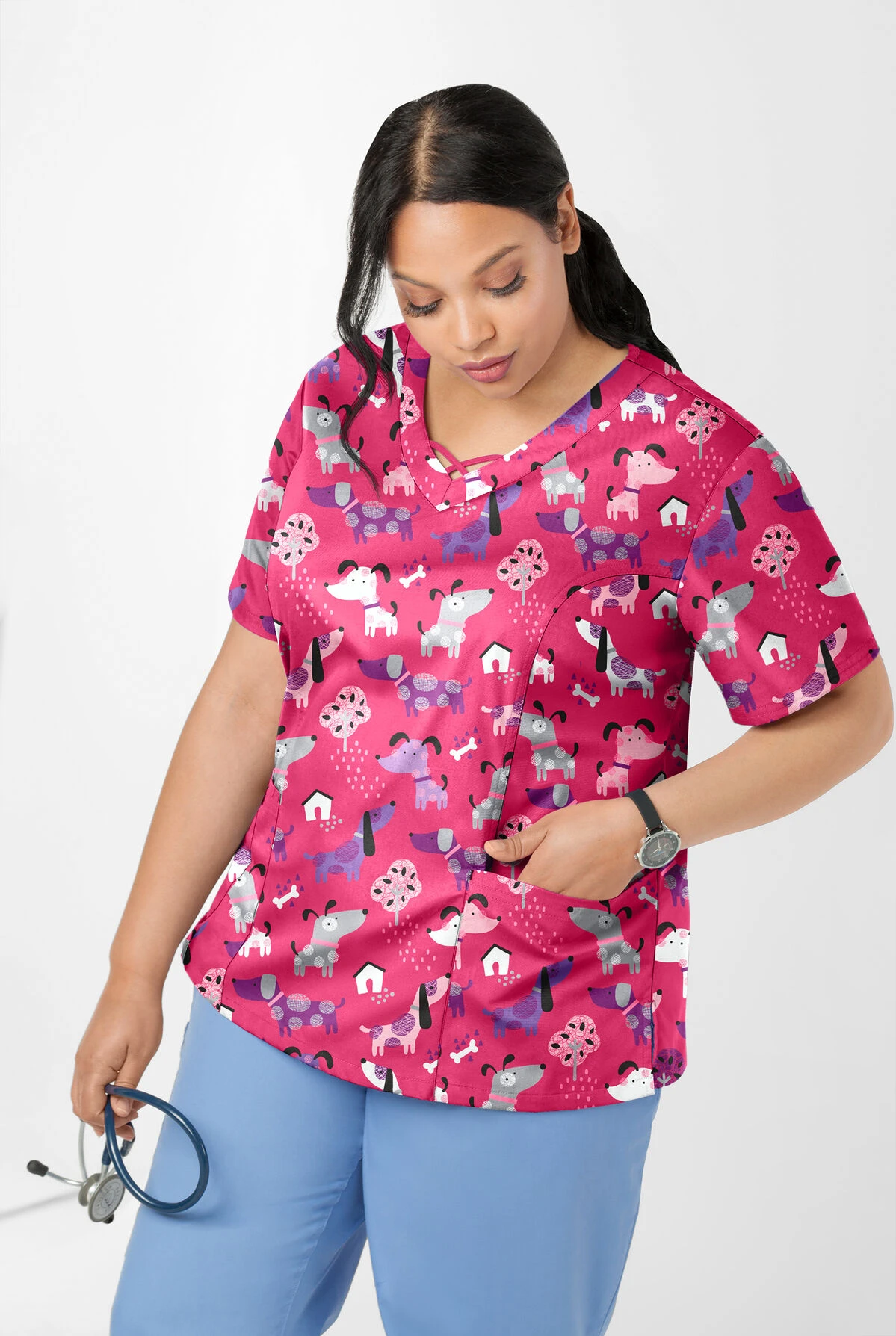 A classic V-neck women’s scrub top with a twist—a cool crisscross neckline. Sleek front pockets offer a divider stitch to hold your cell phone or instruments. What do you hope to see on a walk in the park? Pink puppies, of course!