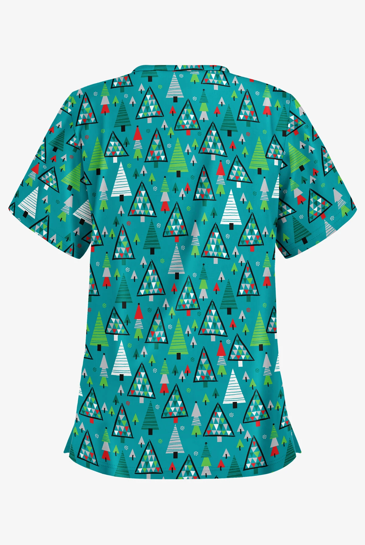 Looking for a scrub top with a little extra breathing room? Designed with a relaxed fit in a classic V-neck shape, our two-pocket top is the one. A print that seems inspired by vintage Christmas shows of the 60s. A sea of graphic trees – so fun.