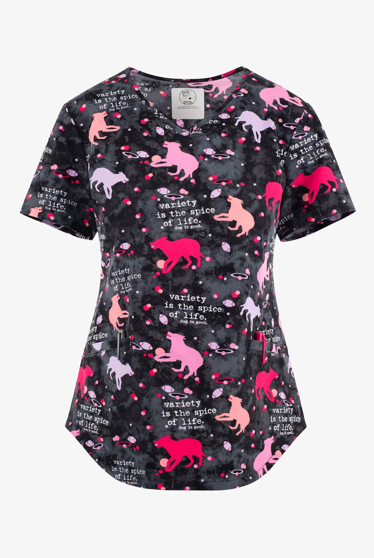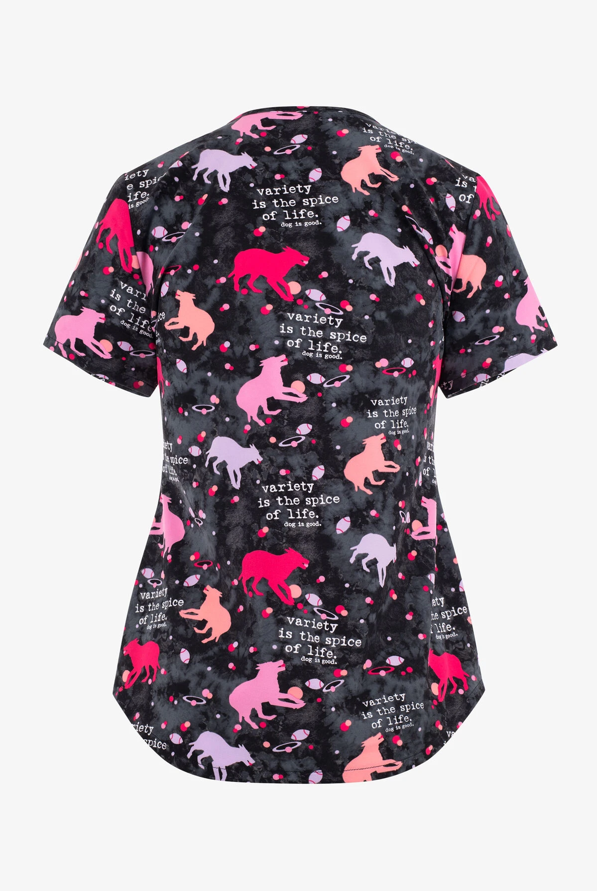 - Dogs with balls and “Variety is the spice of life” on a black and pewter mottled background