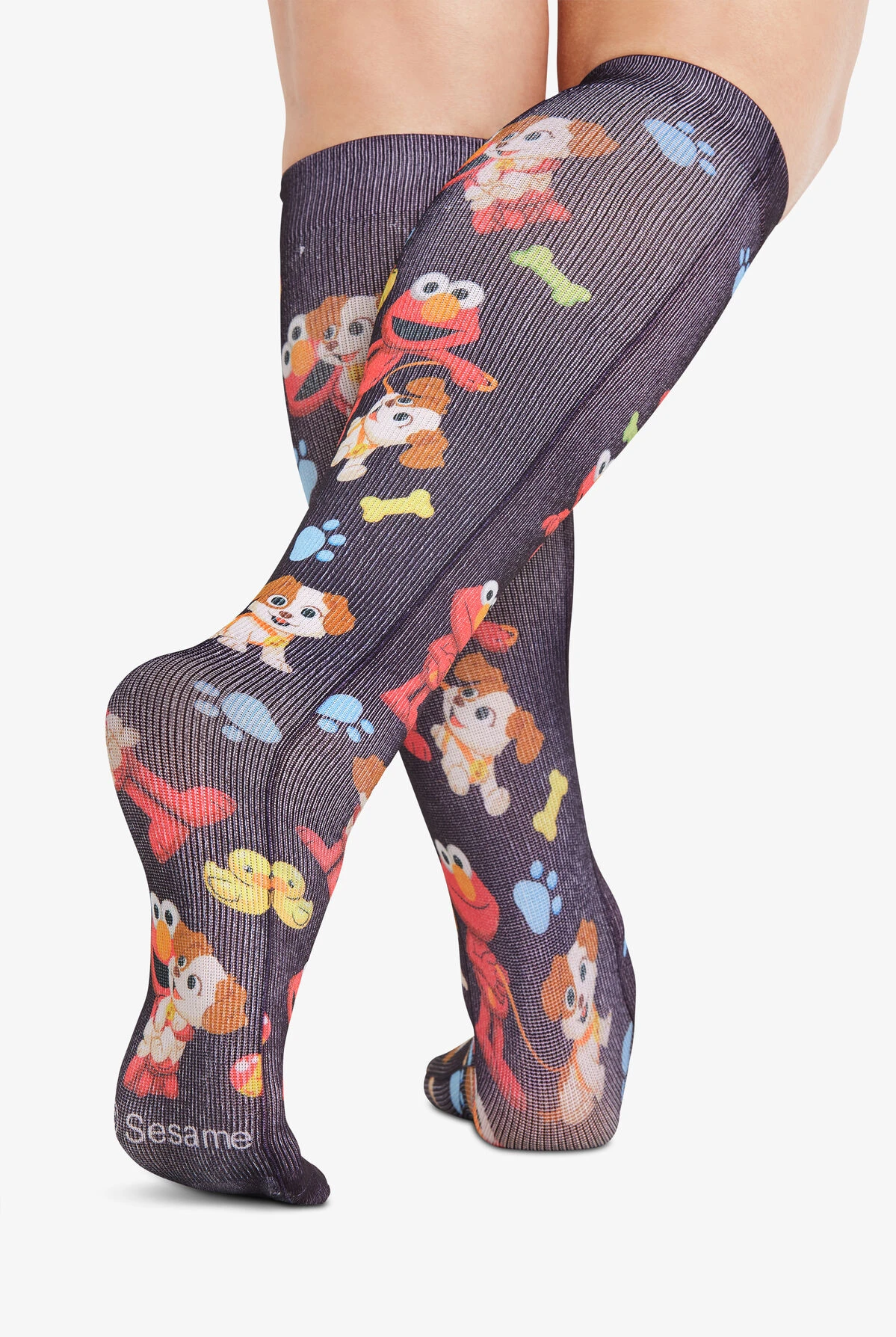 - From Sesame Street Elmo and his puppy Tango on a black background dotted with bones, balls, paw prints, sticks, and rubber duckies