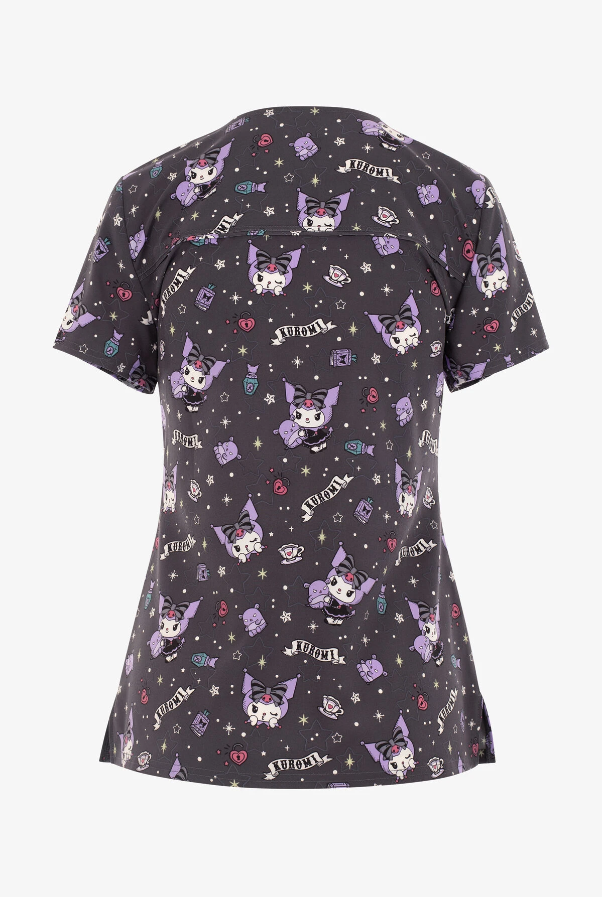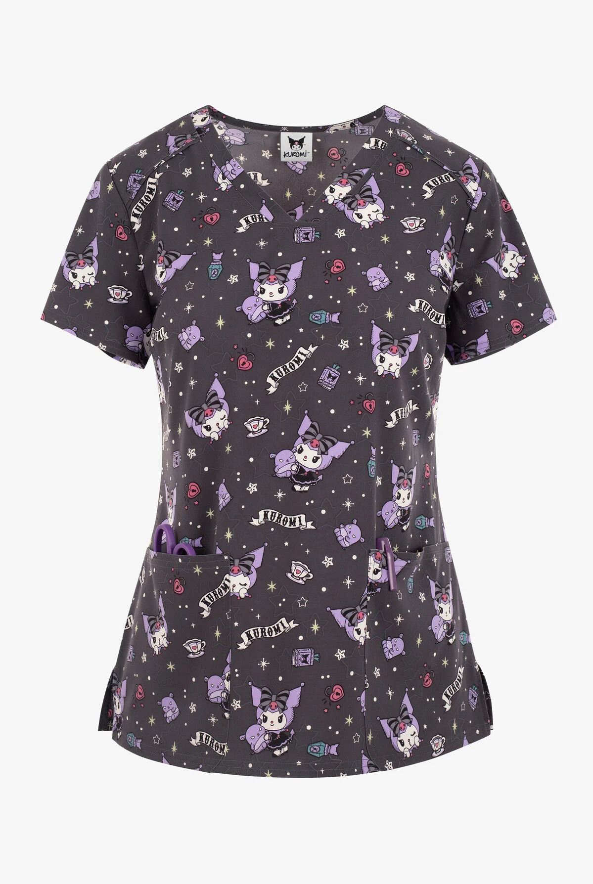- Sanrio’s Kuromi is popping up all over in this fun goth inspired print on a pewter background strewn with heart locks, stars, perfume bottles and tea cups.