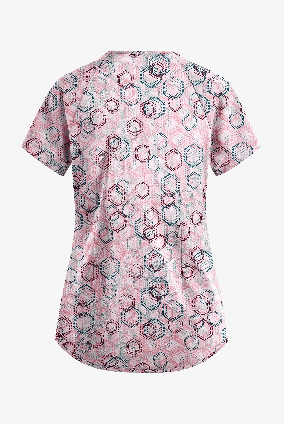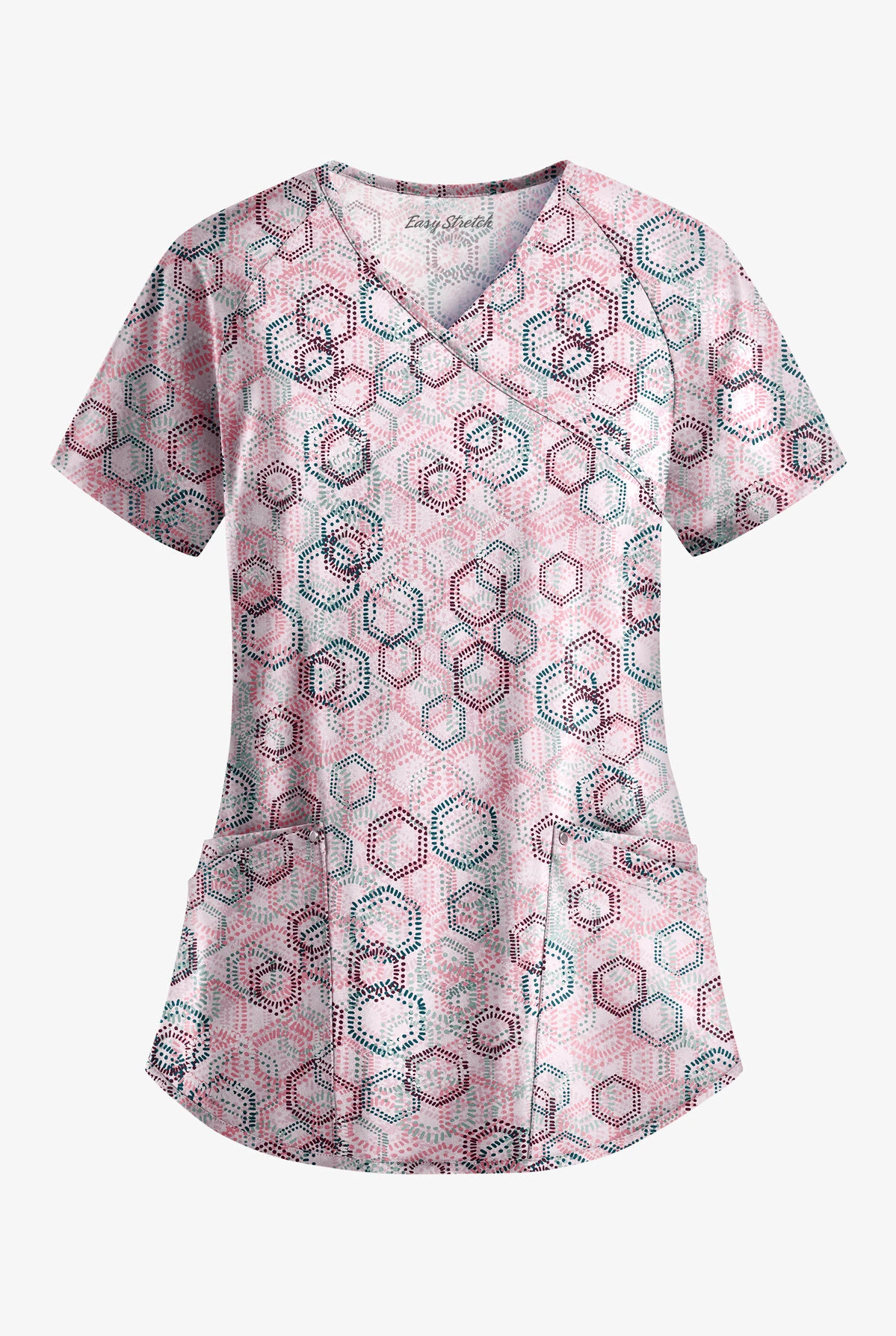 Raglan sleeves and a crossover v-neckline give a traditional scrub top a subtle update. This print is like looking through a glass of pink champagne – bright and bubbly.