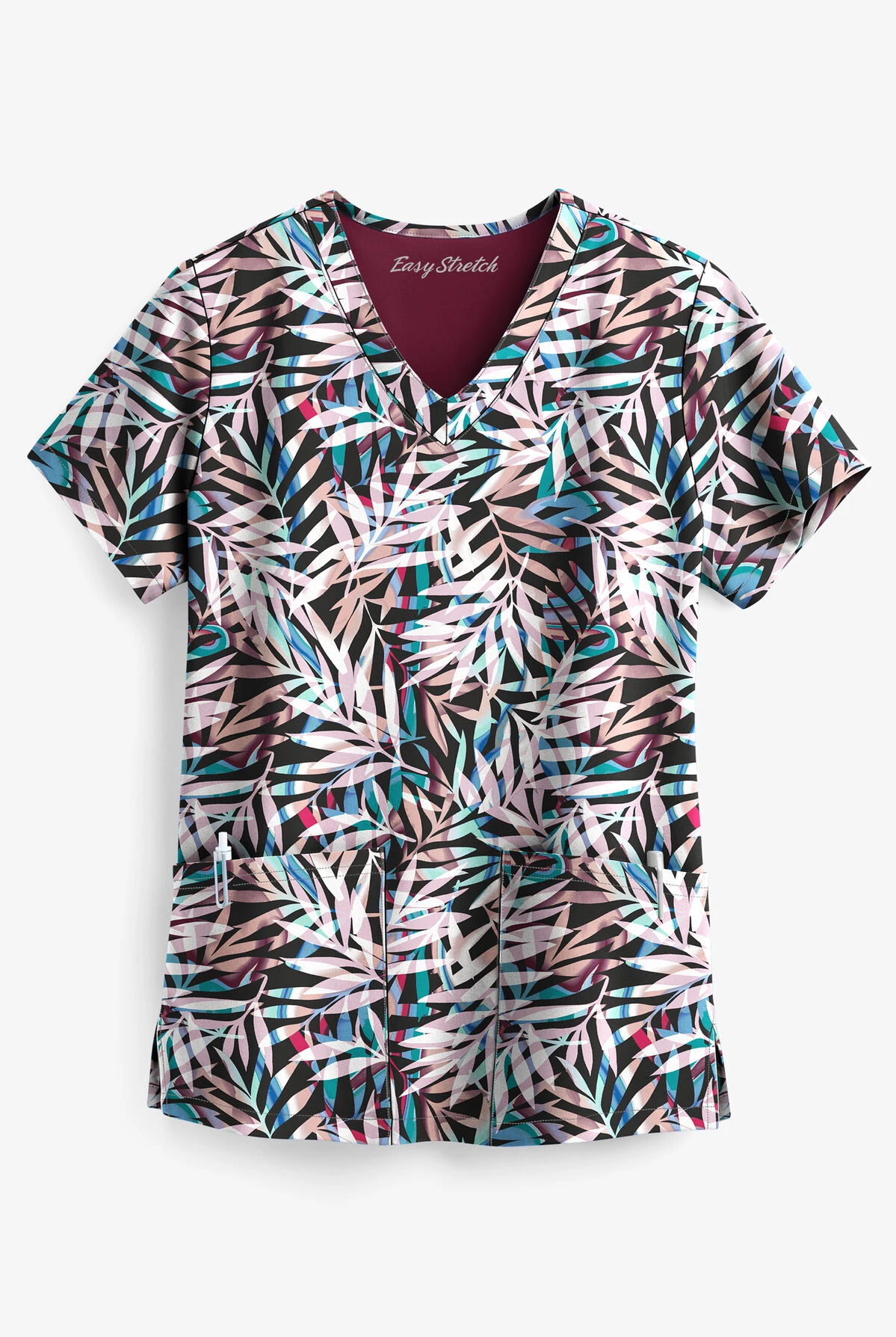 The Easy Stretch by Butter-Soft falling fronds onyx black print scrub top is a great choice for any nursing wardrobe! This top has a classic fit with flattering ‘v’ neckline style. For storage it has two roomy front pockets and side vents for greater range of motion. It has back darts on garment for flattering fit. Fabric content is 93/7 poly/spandex. Approximate length for size M is 27 ½”.