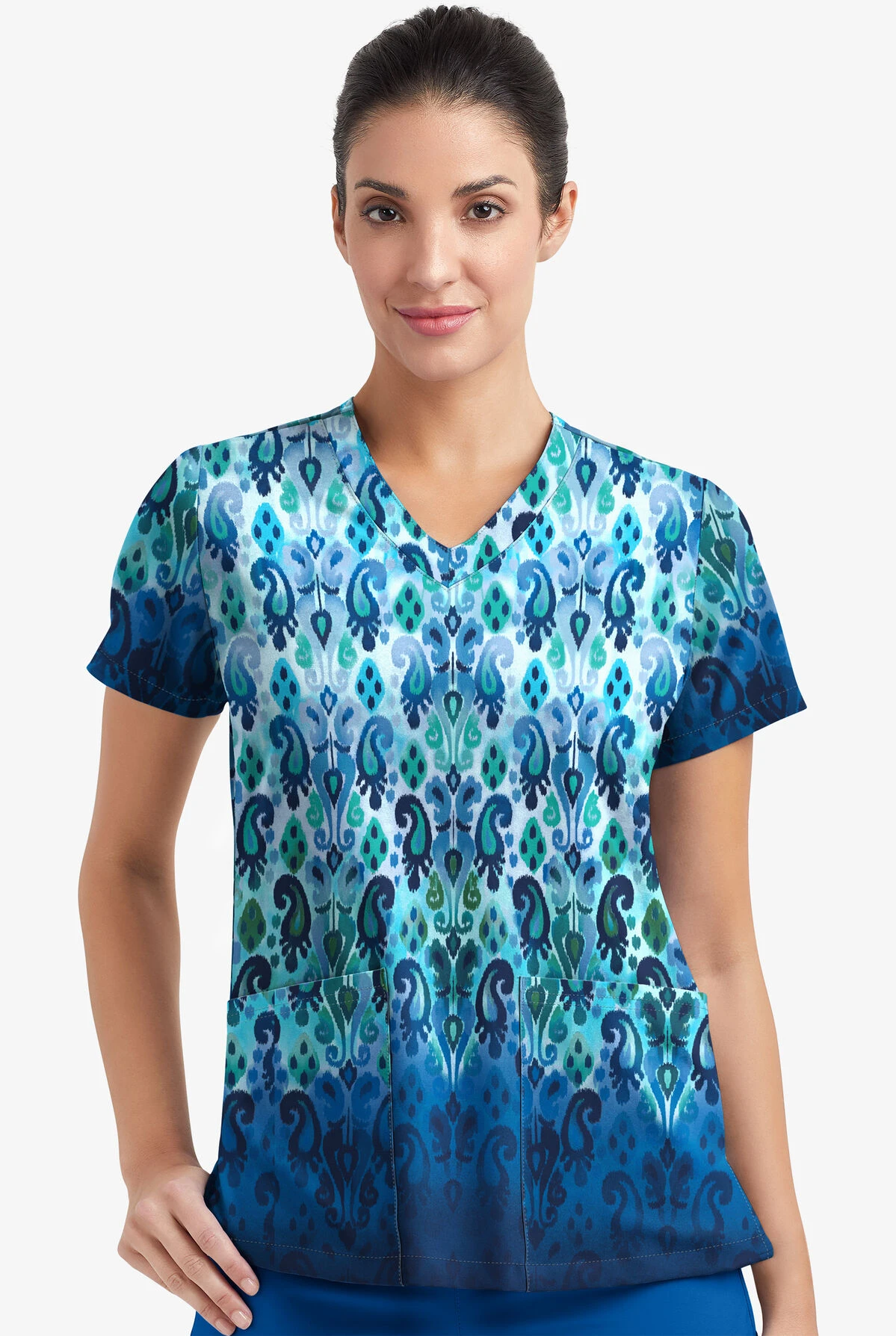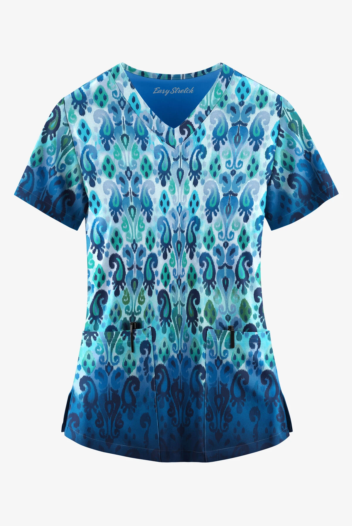 The v neckline is classic for a reason—it’s almost universally flattering. Other flattering things about this top? Back vents and side vents. They add shape and ease, respectively.. Ikat? Border print? Both! The gradient in shades of navy, turquoise and teal makes it so pretty.