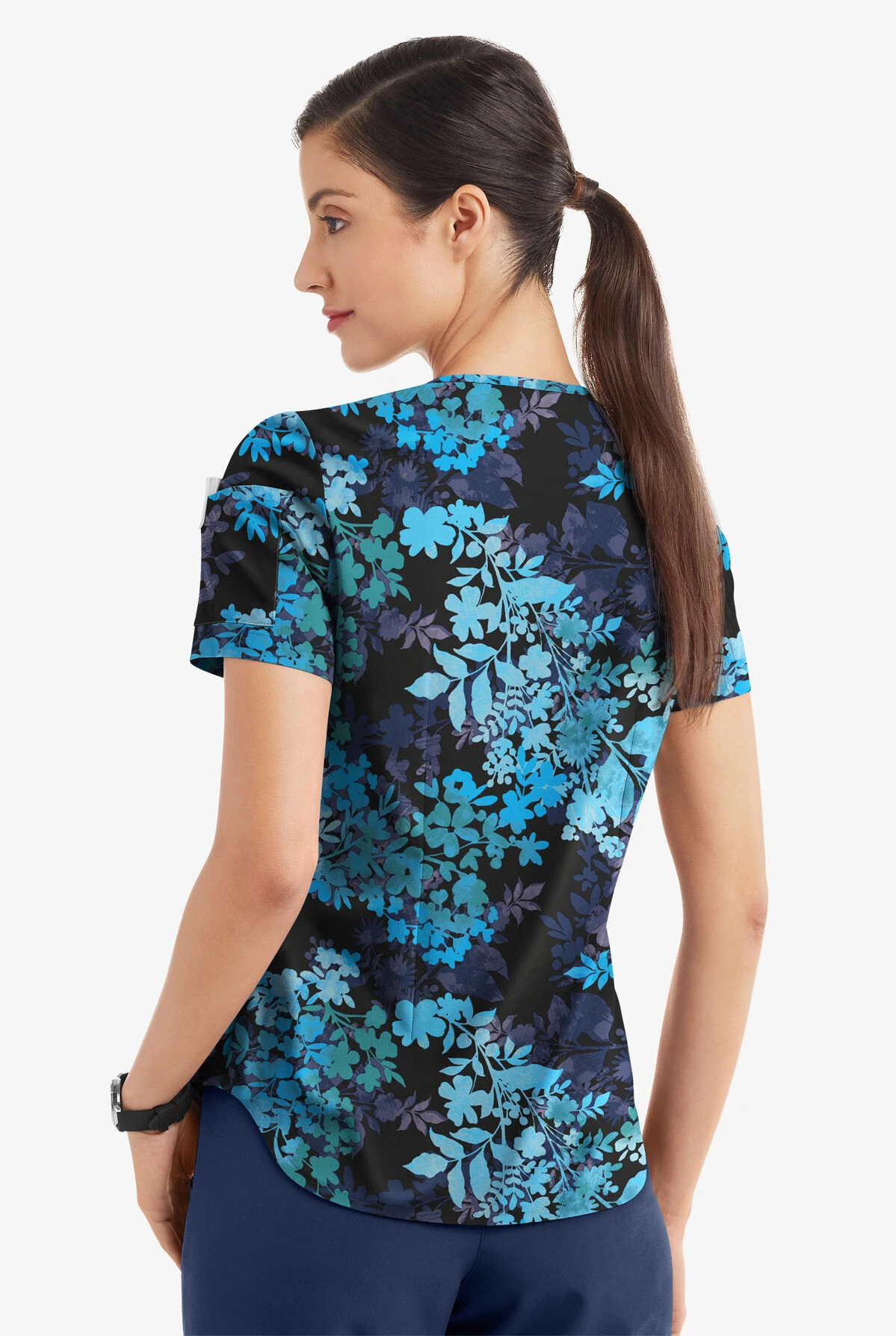 If you like the option to tuck your tops in or wear them loose, our v-neck tuck-in scrub top is made for you! Polished shape and fabric lend themselves well to the perfect tuck every time. Easy Stretch by Butter-Soft scrub collection is designed for a modern look and easy fit for very long shifts and made with performance 4-way stretch comfort fabric. Clustered floral in shades of blue on a black background? Lovely!