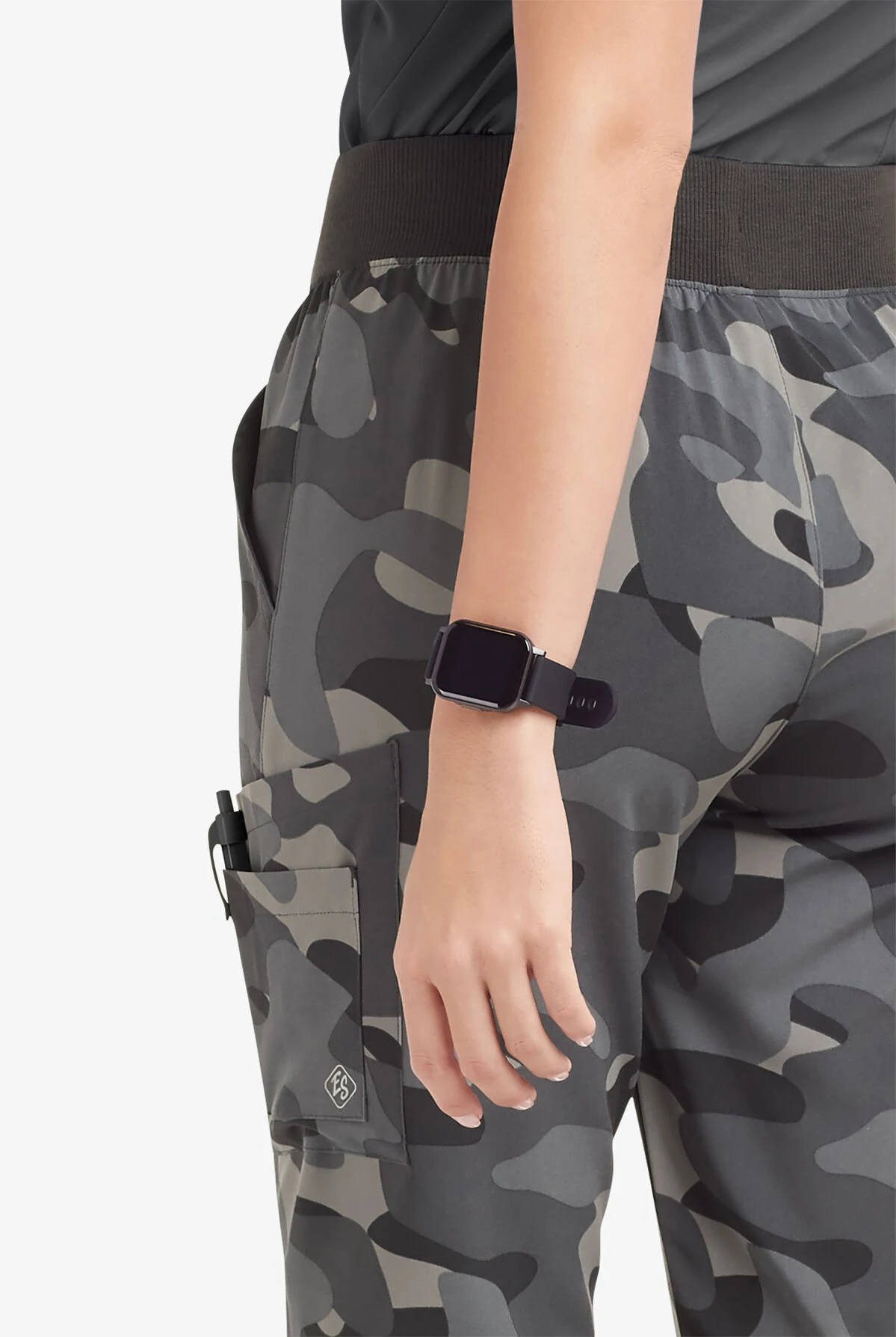 The Easy Stretch by Butter-Soft™ women’s 5-pocket Mila knit waist jogger print scrub pants feature a contemporary fit with a tapered jogger silhouette. The elasticized knit waistband with drawstring sits just below the natural waist and provides comfort and security. For storage, you will find 2 angled front pockets, 1 cell phone pocket, and 2 roomy cargo pockets with a flattering angled design. There are knit cuffs and back knee seam detail. Made of easy care 93/7 poly/spandex.