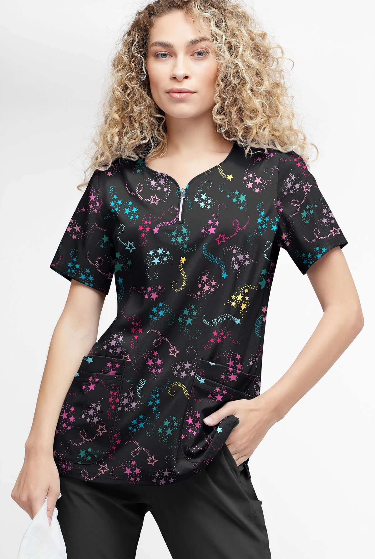 Versatility! You love it and so do we. A shiny nickel zipper at the curvy v neckline of this cute top gives you styling options. Darts front and back give it great shape. And pockets!