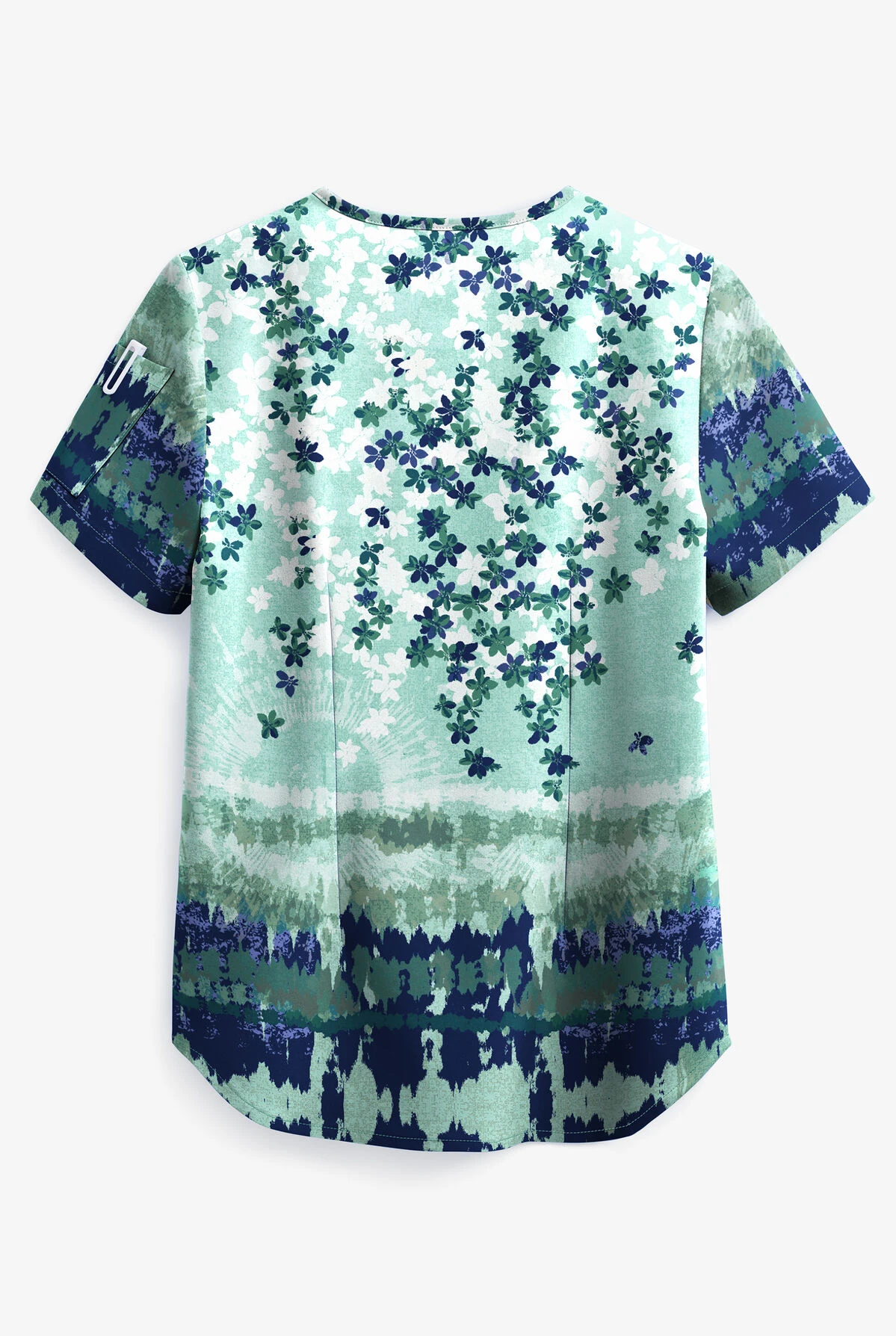 The UA watercolor floral sea jade Chloe one tuck-in print scrub top features a contemporary fit with a flattering curved v-neck and back darts for a more tailored fit. For storage, you will find a double pen pocket on left sleeve and a single chest pocket. The style can be worn tucked-in or out. Made of 93/7 poly/spandex.
