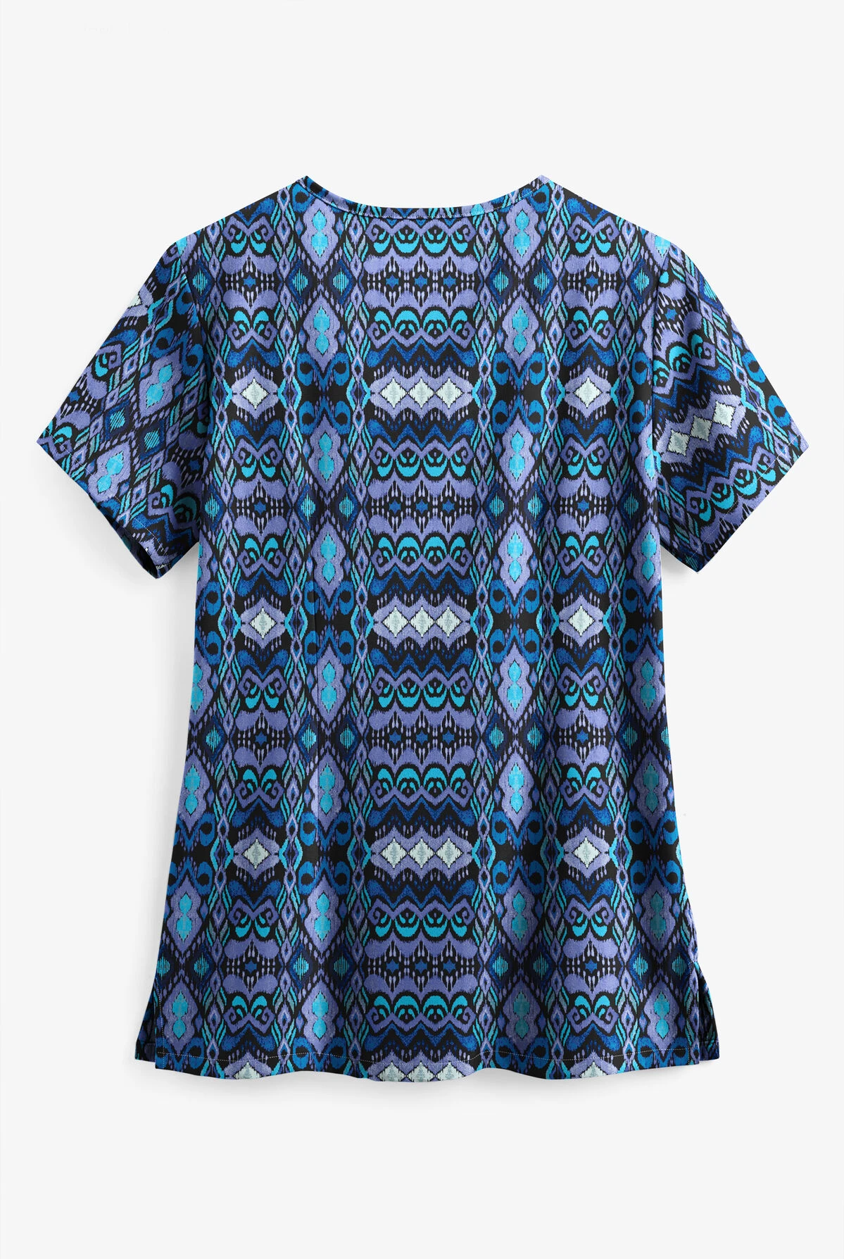 The Easy Stretch by Butter-Soft whispering ikat onyx black print scrub top is a great choice for any nursing wardrobe! This top has a modern fit, deep v-neck with lace-up detail, silver eyelets, and modesty panel. For all of your storage needs, there are four roomy front pockets. Side vents allow for an increased range of motion and back darts provide a better fit. Made of easy care 93/7 poly/spandex blend.