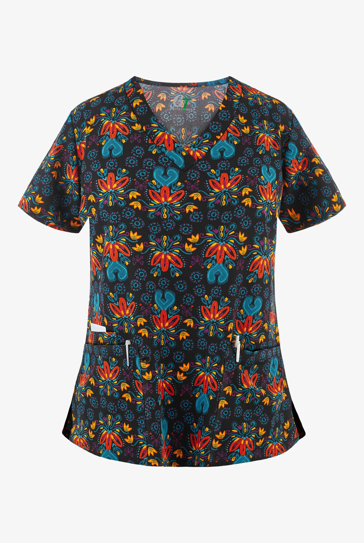 Green Town Ethnic Floral Women’s 3-Pocket V-Neck Print Scrub Top