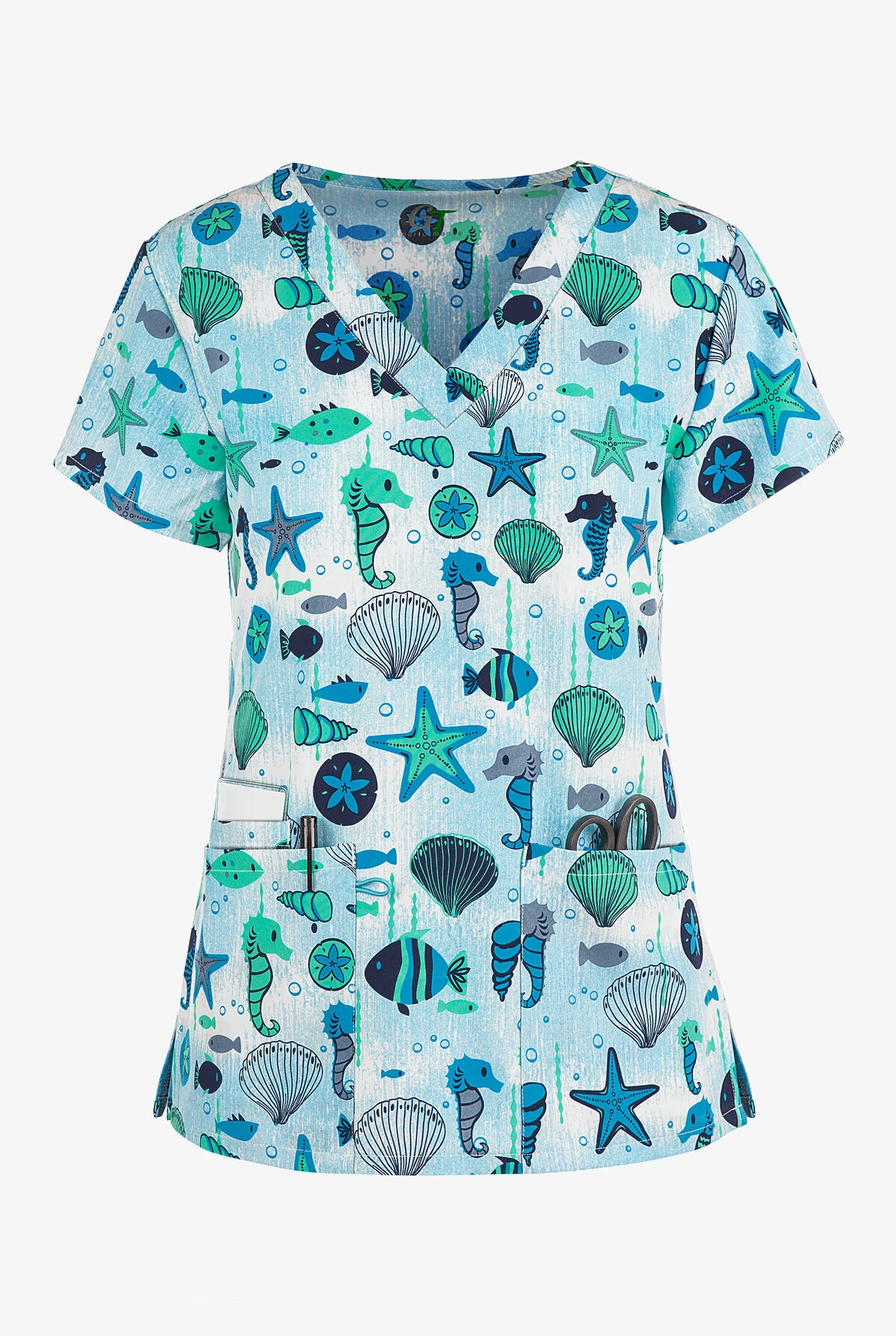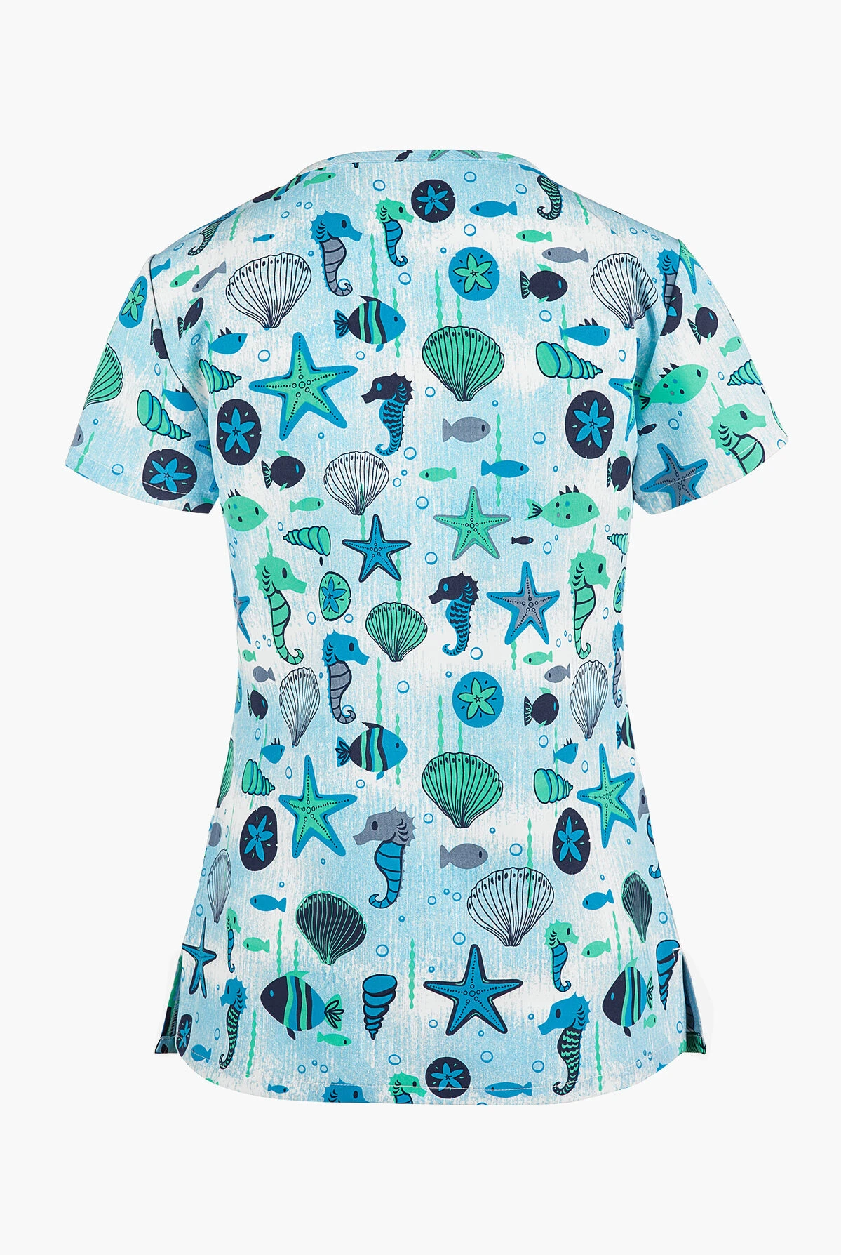- Seahorses, fish, sea stars, and shells on a blue and white background
