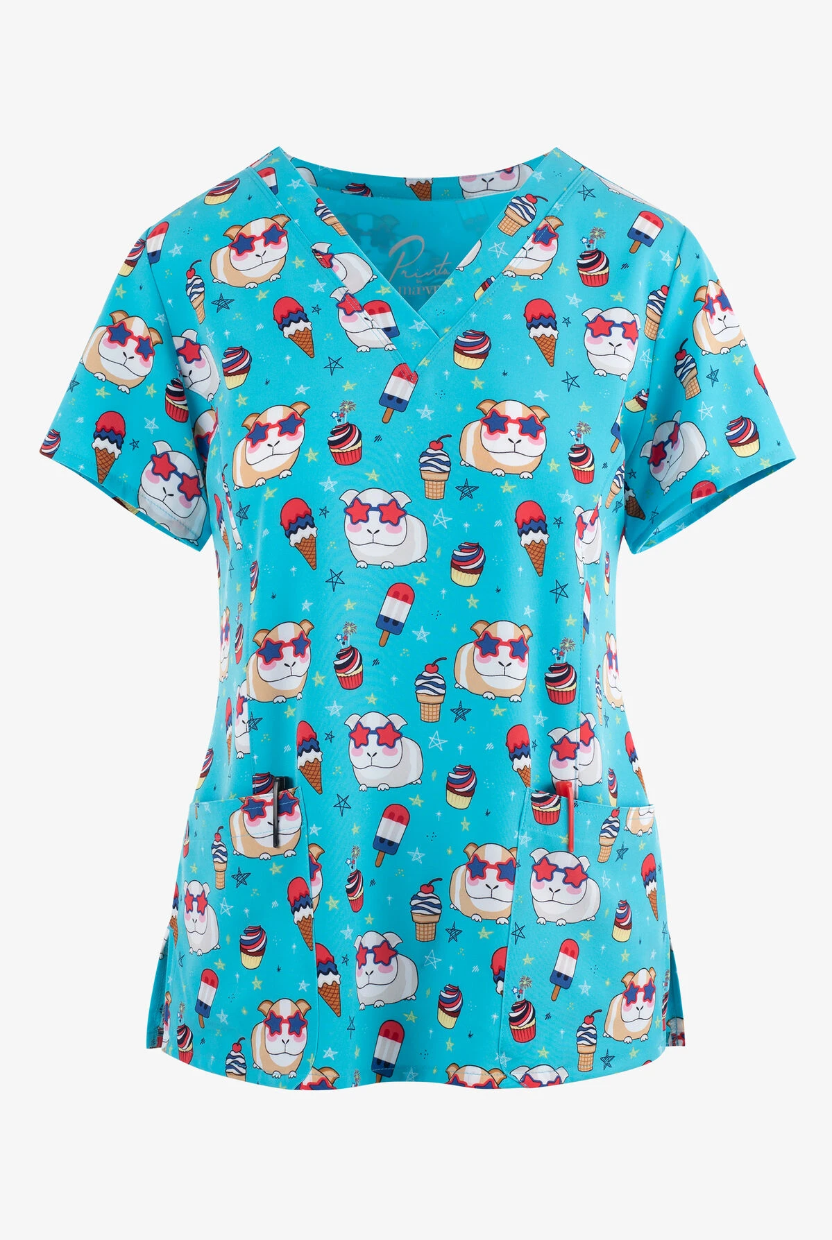 - Ice cream cones, cupcakes, and star sunglass wearing guinea pigs on a star spangled turquoise background