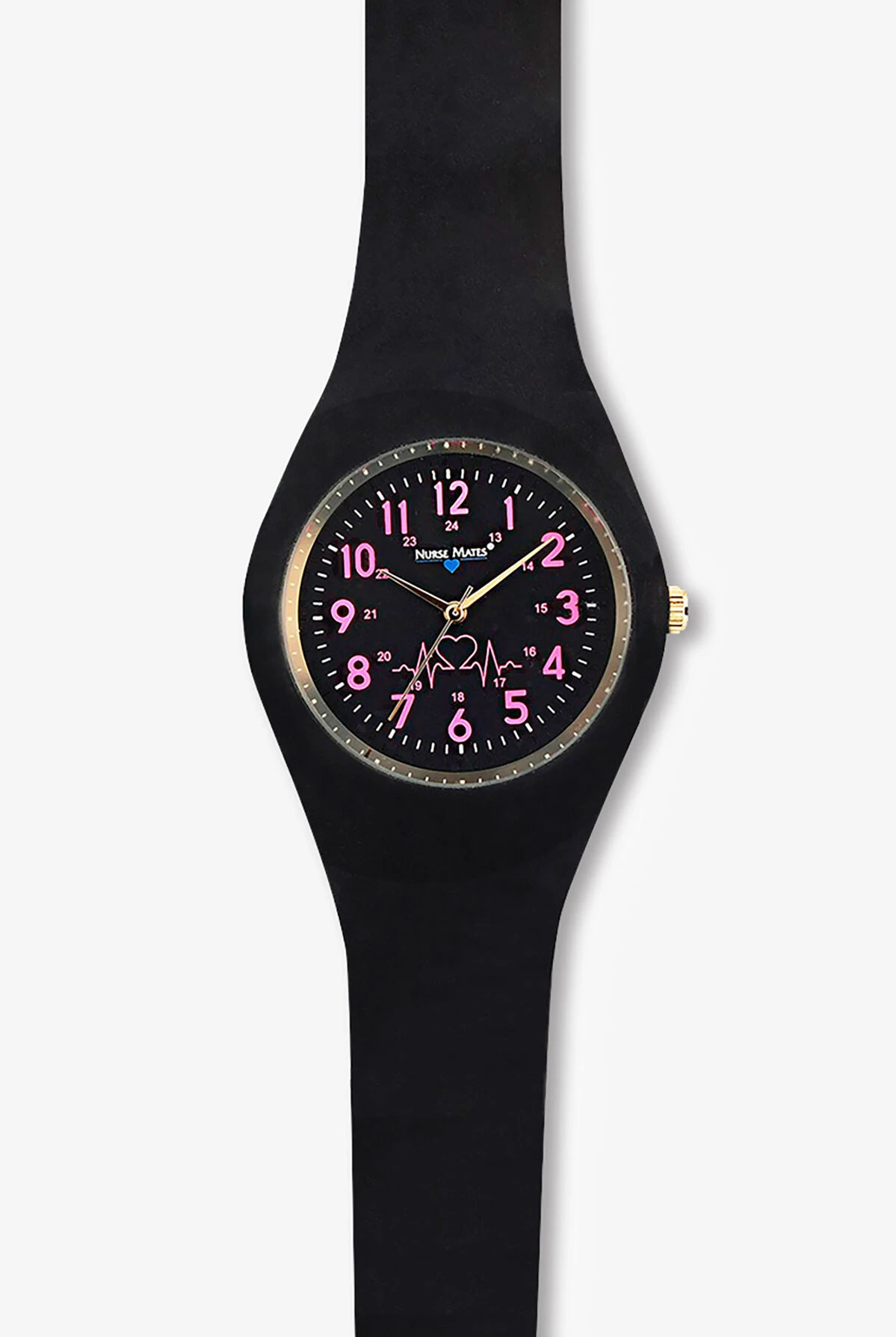 Seamless construction makes this Nurse Mates Uni-Watch easy to clean and maintain. A contrast bezel and stem add a little style. Water-resistant construction with an easy-to-read face.