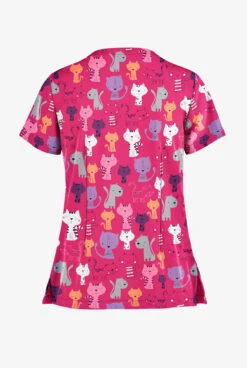 Butter-Soft Paris Cats Fuchsia Women’s 2-Pocket Keyhole V Neck Printed Scrub Top