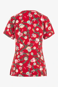Betsey Johnson Merry Donuts Christmas Women’s 2-Pocket STRETCH V-Neck Print Scrub Top