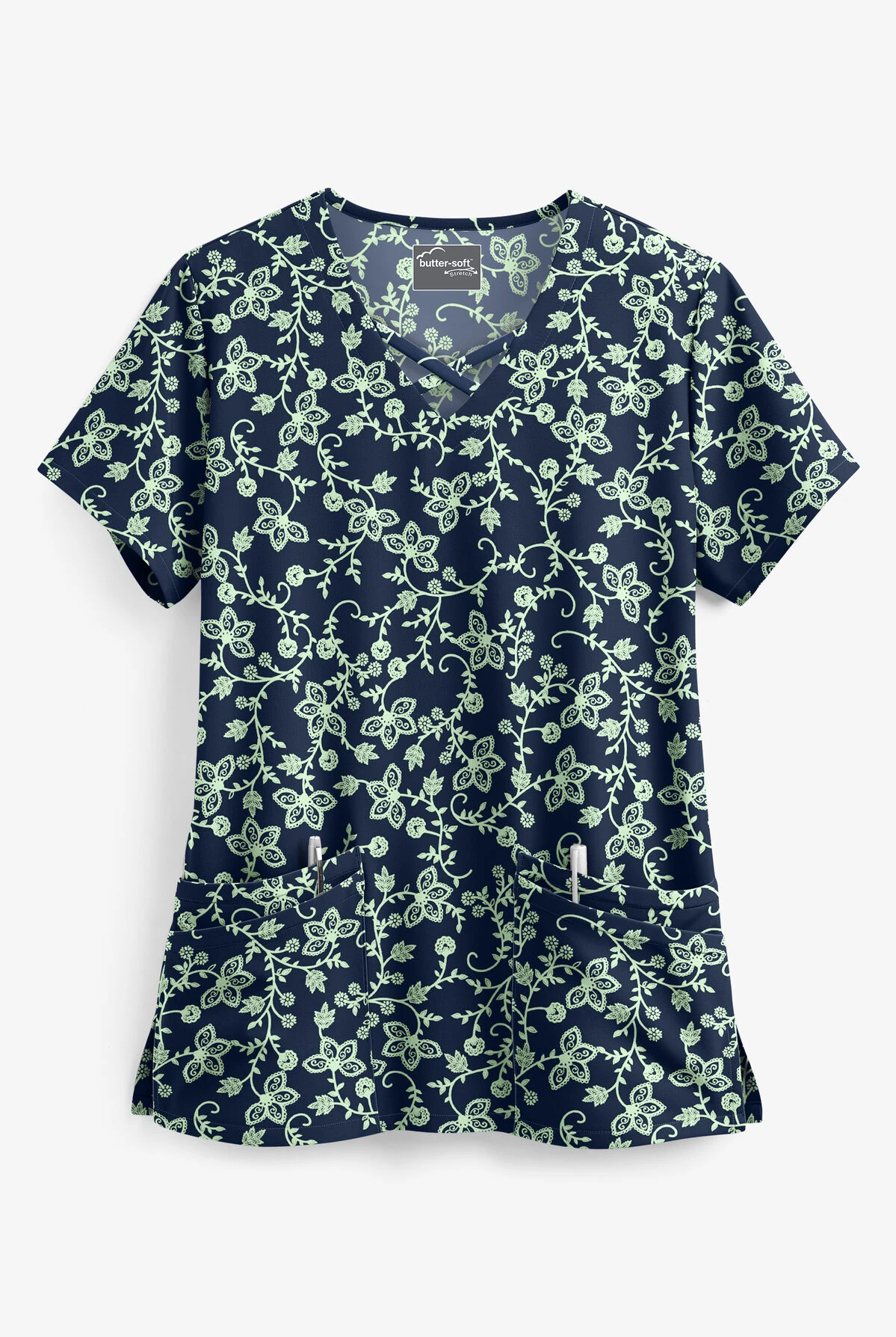 UA Butter-Soft STRETCH Floral Vines Navy Women’s 4-Pocket Criss Cross Print Scrub Top