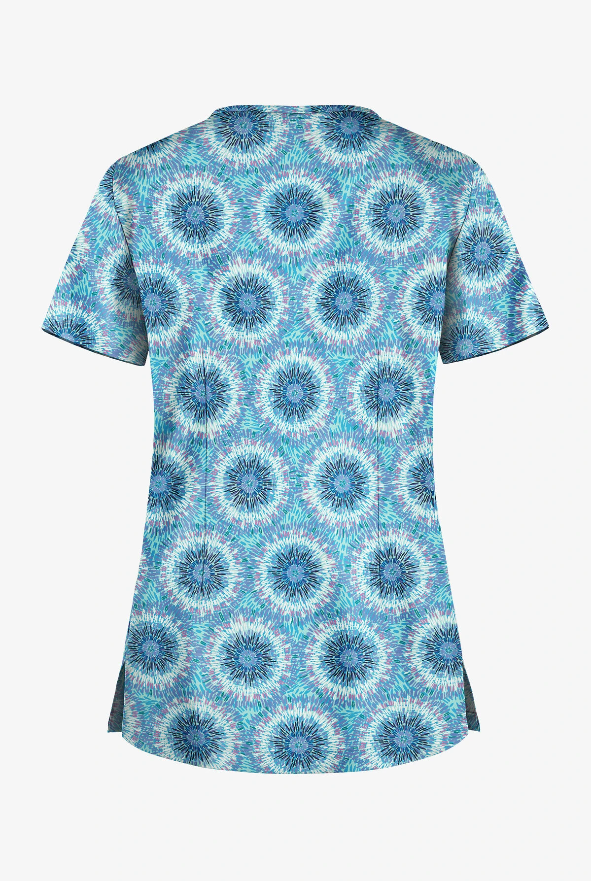 This UA Butter-soft Stretch splash of geo aqua moon women’s 1-pocket v-neck print scrub top features a relaxed classic fit and overlap detail. The back darts and bust darts provide a flattering fit. This top’s clean silhouette with single chest pocket makes it ideal for a tuck-in style. For your convenience, there is an id badge loop at the left shoulder. Made of 93/7 poly/spandex.