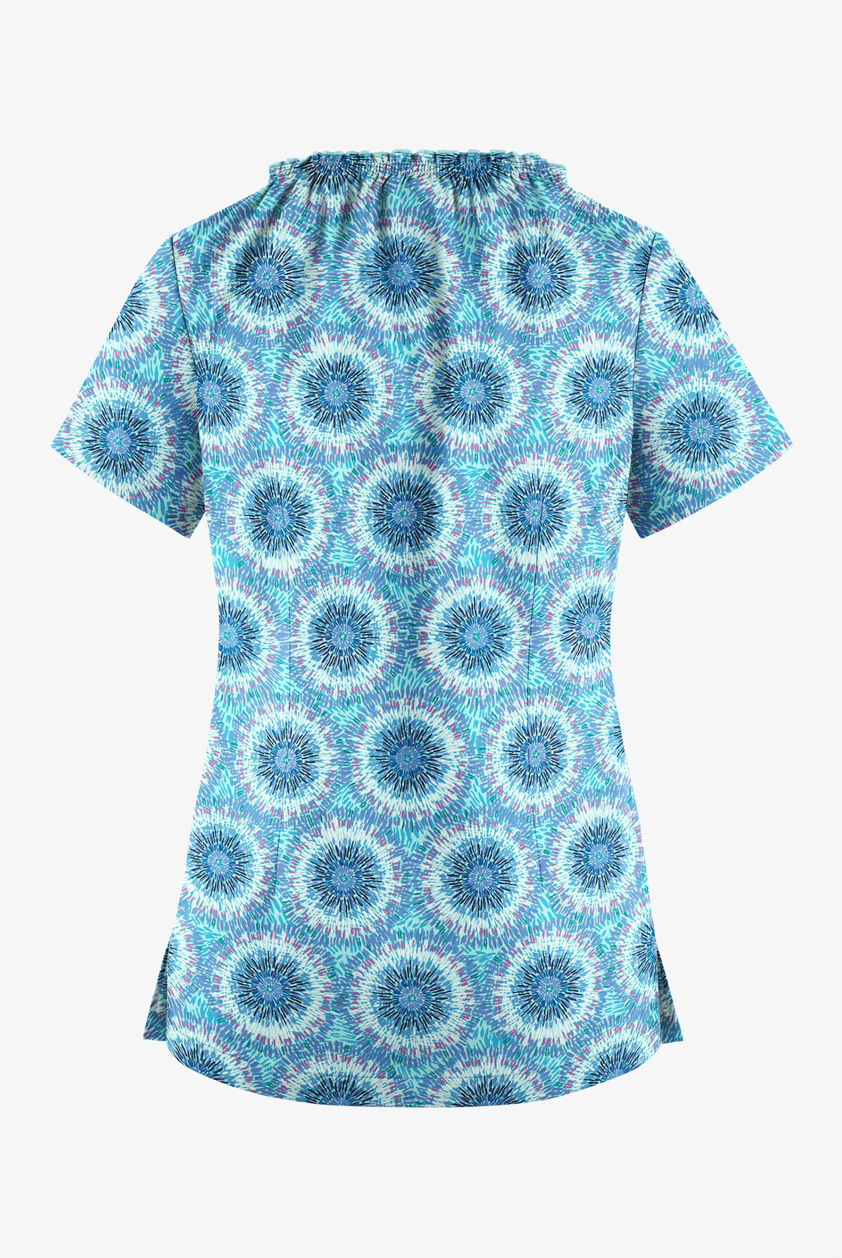 This UA Butter-soft Stretch splash of geo aqua moon women’s 6-pocket peasant style print scrub top features a modern fit and a gently gathered neckline with a key-hole button closure. It has 6 total pockets; 4 large front pockets and 2 pen pockets. Darts in the back for fit. Side vents for ease of movement. Made of 93/37poly/spandex.
