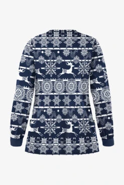 Butter-Soft Nordic Winter Navy Women’s 2-Pocket Warm-Up Print Scrub Jacket
