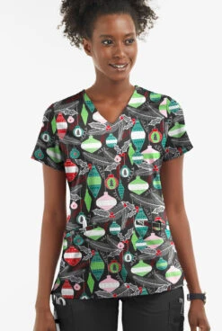 Butter-Soft Christmas Baubles Women’s 2-Pocket With Angled Welts V-Neck Print Scrub Top
