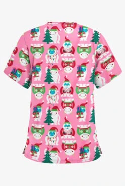 Butter-Soft Happy Monsters Pink Women’s 3-Pocket V-Neck Print Scrub Top