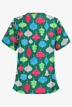 Butter-Soft Festive Ornaments Hunter Women’s 2-Pocket Relaxed Fit V-Neck Print Scrub Top