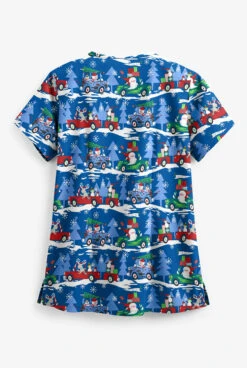 Butter-Soft Traveling With Santa Royal Women’s 5-Pocket Rounded V-Neck Print Scrub Top