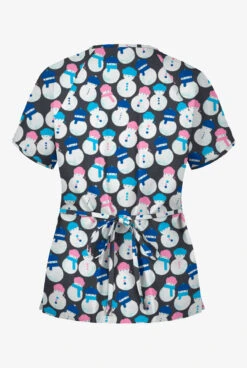 Butter-Soft Snowman Party Pewter Women’s 2-Pocket Mock Wrap Print Scrub Top