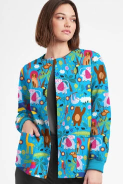 Butter-Soft Originals Jungle Party Turquoise Women’s 3-Pocket Warm-Up Printed Scrub Jacket