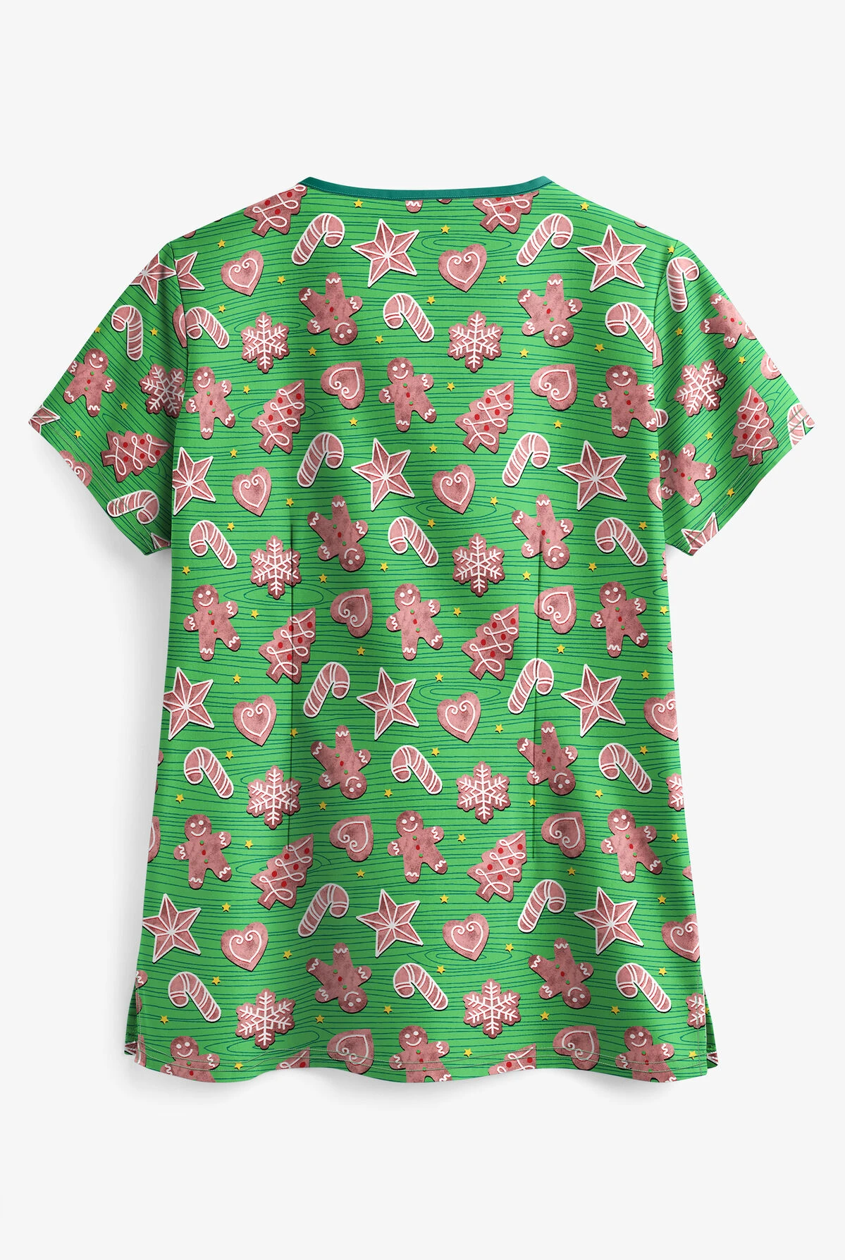 The UA Gingerbread Cookies Gecko Princess Seam Print Scrub Top features a v-neckline and front yoke with Hunter trim. Princess seams, back darts, and side slits create a flattering fit. This colorful scrub top has 2 double pockets to store all of your essentials. The fabric content is 55/45 cotton/poly.