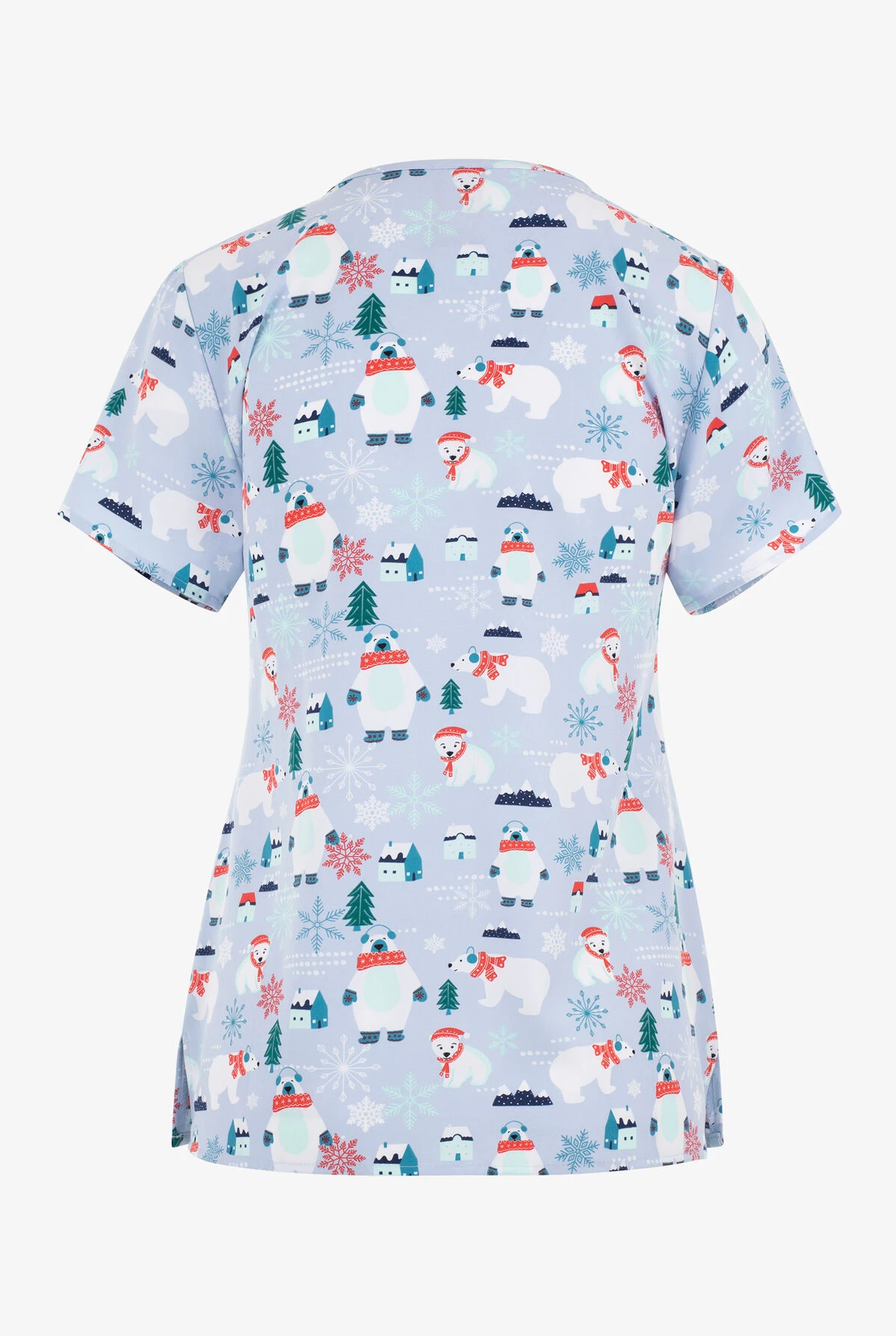 - Bundled-up polar bears amongst snow-capped mountains, evergreens, cozy homes and snowflakes on a powder blue background